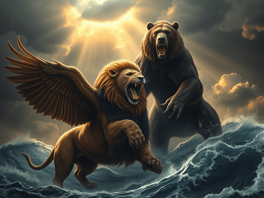 Daniel 7:3 “Ug migula gikan sa dagat ang upat ka mga dagkung mananap, nga nagkalainlain ang usa ug usa.”